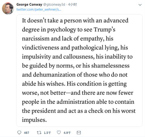 随后,CNN似乎还略带“挑事”嫌疑地援引特朗普最得力的顾问——白宫高级顾问凯莉安妮·康韦的丈夫乔治·康韦18日在推特上的话,指责特朗普患有“自恋型人格障碍”。不过凯莉安妮·康韦随后紧急灭火表态。