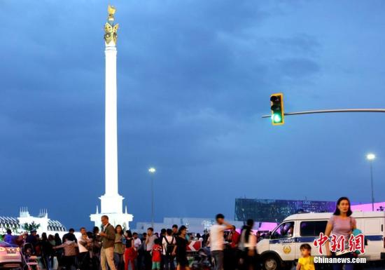 2018年7月6日,哈萨克斯坦迎来第20个首都日。图为当天阿斯塔纳“哈萨克耶勒”纪念碑前举行大型演出庆祝建都20周年,众多市民前往观看。 中新社记者 文龙杰 摄