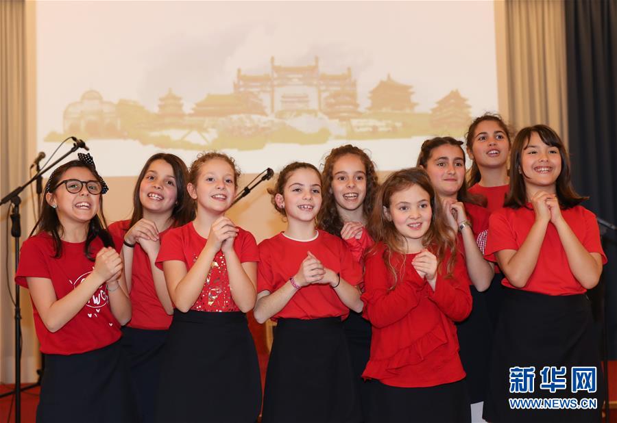 这是2019年2月8日,在意大利拉齐奥的古镇蒂沃利,蒂沃利国立住读学校的学生们在中国春节庆?;疃细蠹野菽?。 新华社记者 程婷婷 摄