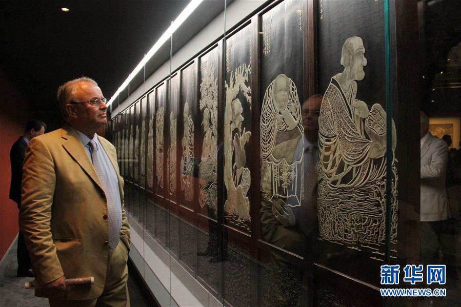 这是2017年7月13日,观众在摩纳哥蒙特卡洛举行的故宫文物展上参观。 新华社记者 张曼 摄