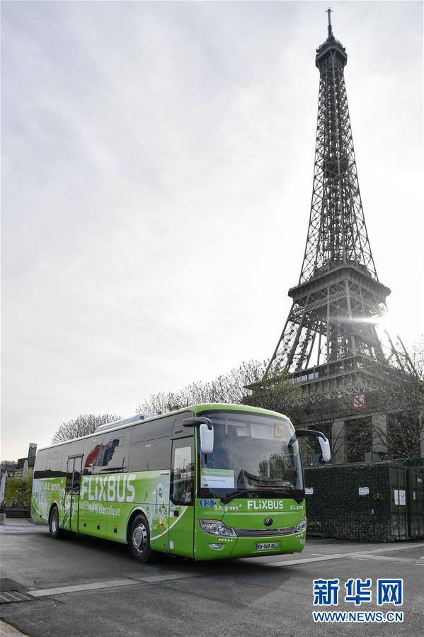 这是2018年4月10日在法国巴黎拍摄的中国宇通电动客车。这辆59座电动客车在法国巴黎至亚眠的城市间长途客运线路上运营。 新华社记者 陈益宸 摄