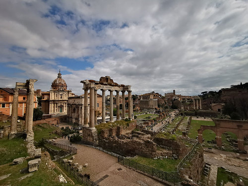 △古罗马广场。位于罗马七丘帕拉蒂尼山和卡比托利欧山之间,它是古罗马时代的城市中心,这片废墟中包含神庙、政府机构、剧场、教堂、商场等遗迹,罗马城最早的建筑(公元前七世纪左右建造)很多位于此地。(央视记者张晓鹏拍摄)
