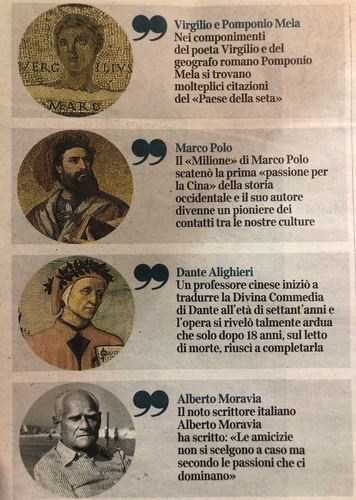 △《晚邮报》特意刊出了习主席署名文章中提到的几位意大利名人的图片。自上而下分别是:生活在约两千年前的古罗马地理学家庞波尼乌斯·梅拉,威尼斯探险家马可·波罗,意大利中世纪诗人但丁和20世纪意大利小说家阿尔贝托·莫拉维亚。(央视记者张颖拍摄)