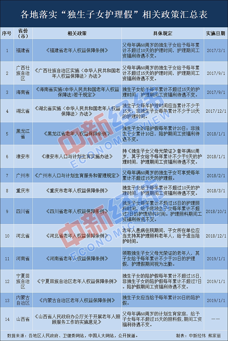 据中新经纬客户端不完全统计,截至2019年3月22日,已至少有福建、广西、海南、湖北、黑龙江、重庆、四川、河北、河南、宁夏、内蒙古、山西等12省份,以及淮安、广州等2市出台了与“独生子女护理假”相关的具体规定。