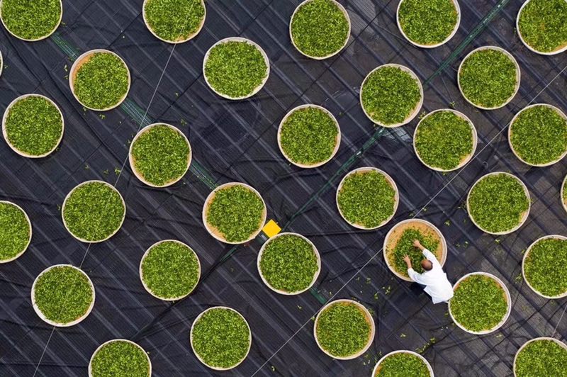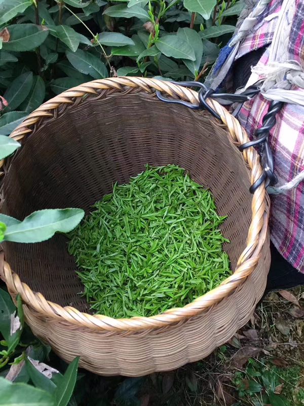 3月23日,清晨时分,采茶工们都聚集在半山腰到山顶的位置采头茶。相比于山脚,这个高度的茶叶长势明显更快。采摘好的青叶,以往是茶农背下山,一般要1.5个小时。现在无人机第一时间将茶叶送到山下的炒茶中心,进行摊青。