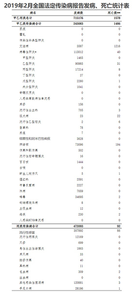 据概况显示,2019年2月(2019年2月1日0时至2月28日24时),全国(不含香港、澳门特别行政区和台湾地区,下同)共报告法定传染病715176例,死亡1578人。其中,甲类传染病无发病、死亡报告。乙类传染病中传染性非典型肺炎、白喉、脊髓灰质炎、人感染H7N9禽流感和人感染高致病性禽流感无发病、死亡报告,其余21种乙类传染病共报告发病243083例,死亡1486人。报告发病数居前5位的病种依次为病毒性肝炎、肺结核、梅毒、淋病以及细菌性和阿米巴性痢疾,占乙类传染病报告病例总数的95%。
