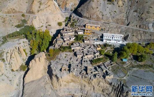 图为楚松村四代房,位于最前面的土坯房是“第一代”,再往里的土木房是“第二代”,“第三代”是旁边的砖石房,崭新的两层独家院落为“第四代”房(2018年9月16日无人机拍摄)。 新华社发(旦增尼玛曲珠摄)