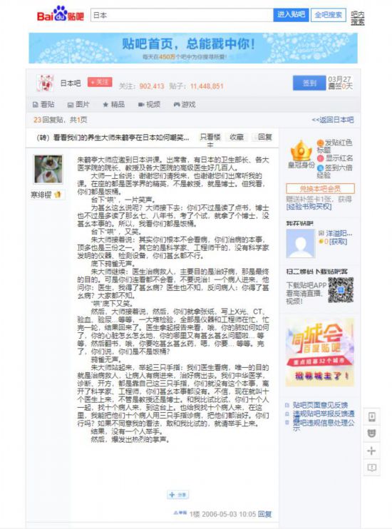 记者同时注意到,这篇文章其实并不是“新闻”。早在2006年5月,百度贴吧日本吧就曾发表过一篇题为《(转)看看我们的养生大师朱鹤亭在日本如何嘲笑他们饭桶~》的贴文,文章内容与上述自媒体所传播的几乎没有多大区别,只不过朱鹤亭的头衔从“养生大师”变成了“中医大师”、“医学大师”……