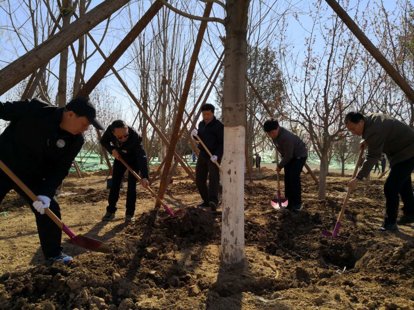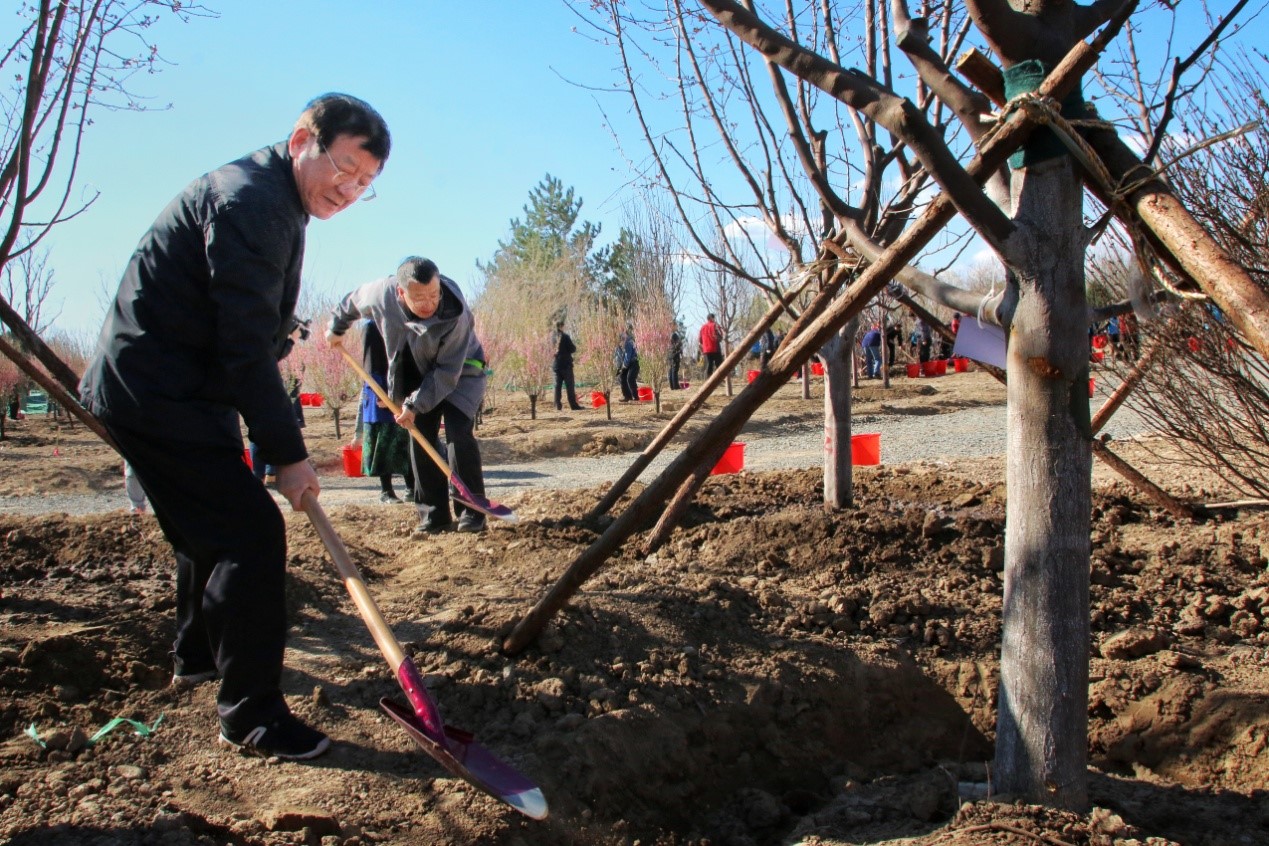 部长们集体乘车来到植树地点后,一下车就拿起铁锹投入到植树劳动中,自动结成劳动小组,相互配合着扶正树苗、回填泥土、围堰浇水,共同栽下油松、银杏、国槐、玉兰、海棠等树木2000余株。