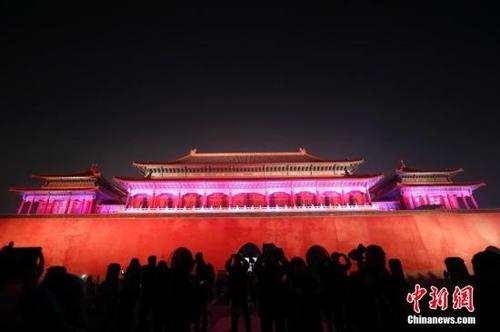 2月19日晚,观众在晚间游览故宫。故宫博物院于正月十五和正月十六举办“紫禁城上元之夜”文化活动,是故宫博物院建院94年来第一次在晚间免费对公众开放,也是紫禁城古建筑群第一次在晚间被较大规模点亮。中新社记者 杜洋 摄