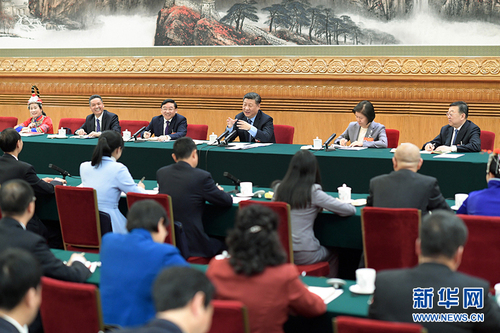 3月4日下午,中共中央总书记、国家主席、中央军委主席习近平看望参加全国政协十三届二次会议的文化艺术界、社会科学界委员,并参加联组会,听取意见和建议。 新华社记者 姚大伟 摄