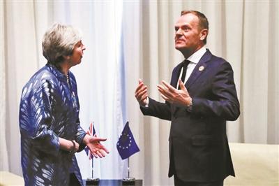 特雷莎·梅(左)与欧洲理事会主席图斯克交谈