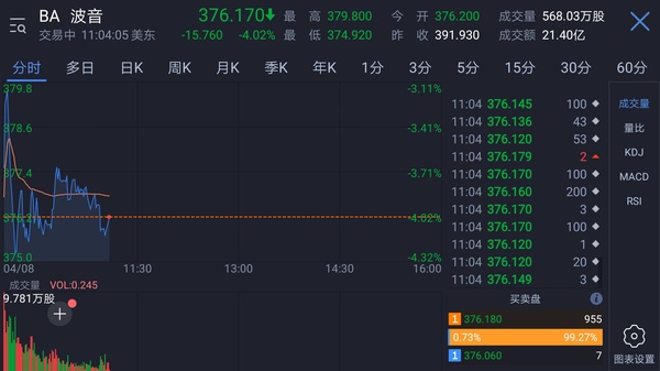 本周一,波音公司美股低开4%,截至发稿下跌4.02%。