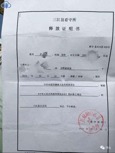 龙先生出示的《广西三江侗族自治县公安局拘留通知书》显示,小龙涉嫌寻衅滋事罪于2月25日被刑事拘留,羁押在广西三江侗族自治县看守所。另一份《三江县看守所释放证明书》显示,小龙出生于2002年5月10日,经三江县公安局决定,于3月9日对其予以释放,原因标注为“不应对犯罪嫌疑人追究刑事责任”。