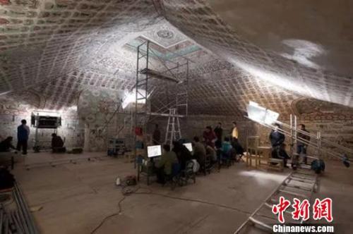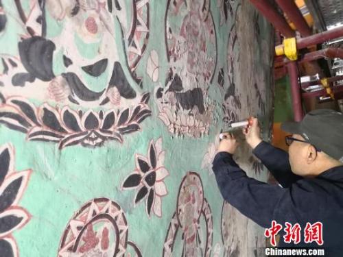 资料图:为敦煌守护者在修复壁画。 敦煌研究院供图