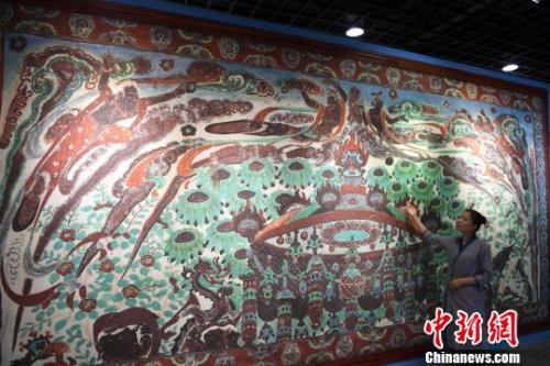 资料图:2018年8月6日,通过数字化采集后打印展出的大幅高保真莫高窟复制壁画320窟“散花飞天”亮相敦煌。 杨艳敏 摄