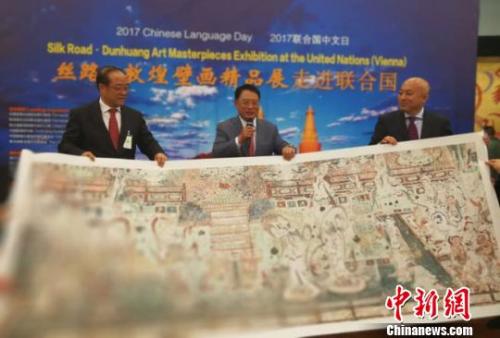 资料图:2017年5月8日,2017联合国中文日活动“丝路-敦煌壁画精品艺术展走进联合国”展览在维也纳联合国大厅开幕。敦煌研究院向联合国机构赠送了敦煌壁画高保真复制品?!≌盼拔?摄
