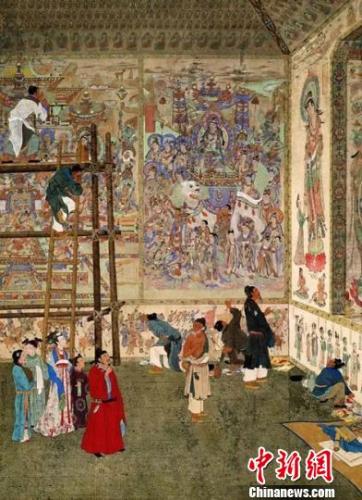 资料图:2017年临近“五一”,敦煌研究院推出《敦煌壁画内和壁画外的劳动者》微信特辑。图为当代著名工笔人物画家潘絜兹1954年作品《石窟艺术的创造者》?!《鼗脱芯吭汗┩?/p>