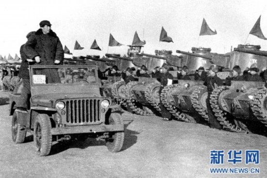 1949年3月25日,中共中央和人民解放军总部机关由河北省平山县西柏坡迁至北平。下午5时,在北平西苑机场举行了盛大的阅兵式,毛泽东、朱德、刘少奇、周恩来等中央领导同志检阅了人民解放军部队。这是毛泽东在检阅坦克部队(资料照片)