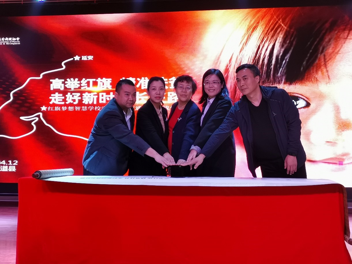 2018年4月12日,首座红旗梦想智慧学校在长征出发地江西省于都县车溪中学落成。截至目前,红旗梦想智慧学校建设启动一周年,已经建设完成了5所红旗梦想智慧学校;开设了70个“红旗梦想自强班”,覆盖3500名建档立卡贫困家庭贫困高中生;“红旗梦想艺术课堂”为长征沿线的374名教师进行了艺术类教育培训,12.5万余名中小学生受益,有力促进了贫困地区艺术教育事业发展。