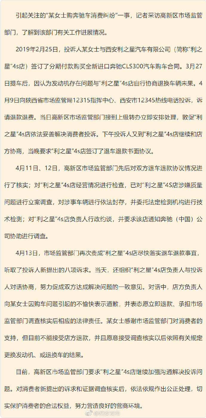 中新网4月14日电 据西安市互联网信息办公室官方微博消息,引起关注的“某女士购奔驰车消费纠纷”一事,记者采访高新区市场监管部门,了解到该部门有关工作进展情况。目前,市场监管部门已对“利之星”立案调查,责成尽快退车退款。