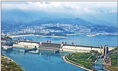 图为4月11日,在湖北省宜昌市夷陵区三斗坪镇黄牛岩村青云顶俯瞰长江三峡工程。