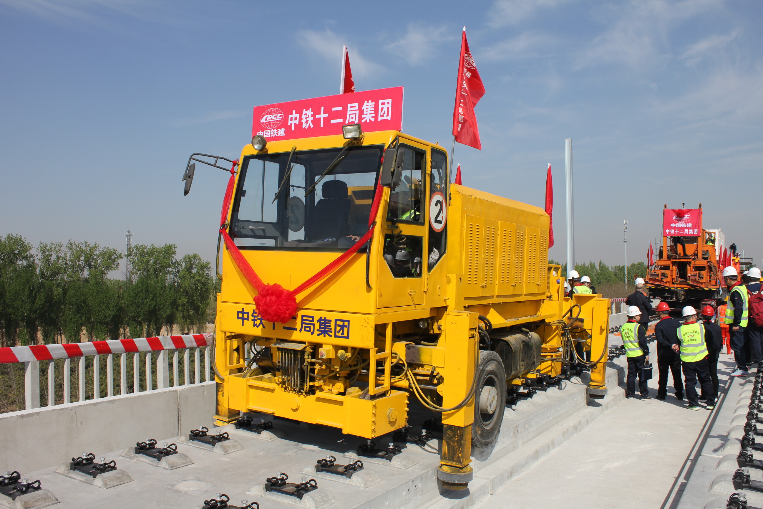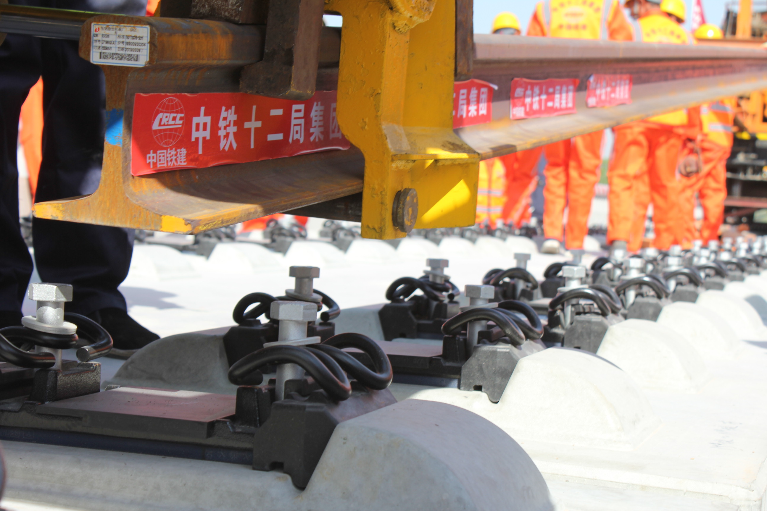 现场施工技术人员表示,施工现场并不具备建设铺轨基地条件,对铺轨作业组织协调能力是一个极大地考验。然而,先进的设备和施工工艺化解了这个难题。具备“运输+推送”功能的长轨运输一体机和此次采用的推送铺轨法,有效减少了传统铺轨作业中的倒运环节,直接“一步到位”,实现了没有铺轨基地也可以快速高效作业的目标。目前,这种方法在国内无砟高铁轨道铺设中使用较少。