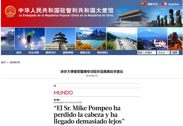 2019年4月14日,智利主流媒体《三点钟报》纸版和网络版同时刊登对徐步大使专访,标题为《蓬佩奥已经失去理智且走得太远》。4月13日,《三点钟报》记者弗朗西斯卡·格蕾罗在使馆采访徐大使。针对美国务卿蓬佩奥4月12日访问智利期间对中国进行大肆恶毒攻击,徐大使在专访中予以有理、有据、有力的驳斥。专访全文翻译如下: