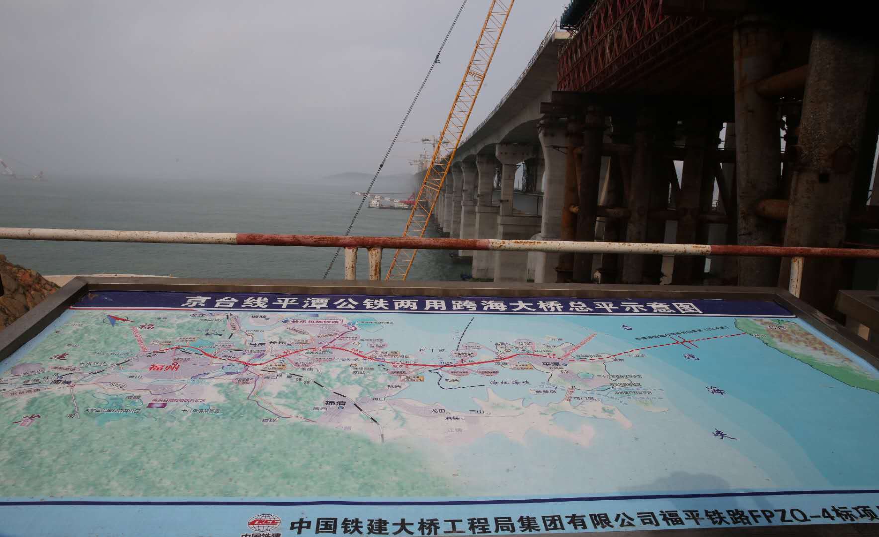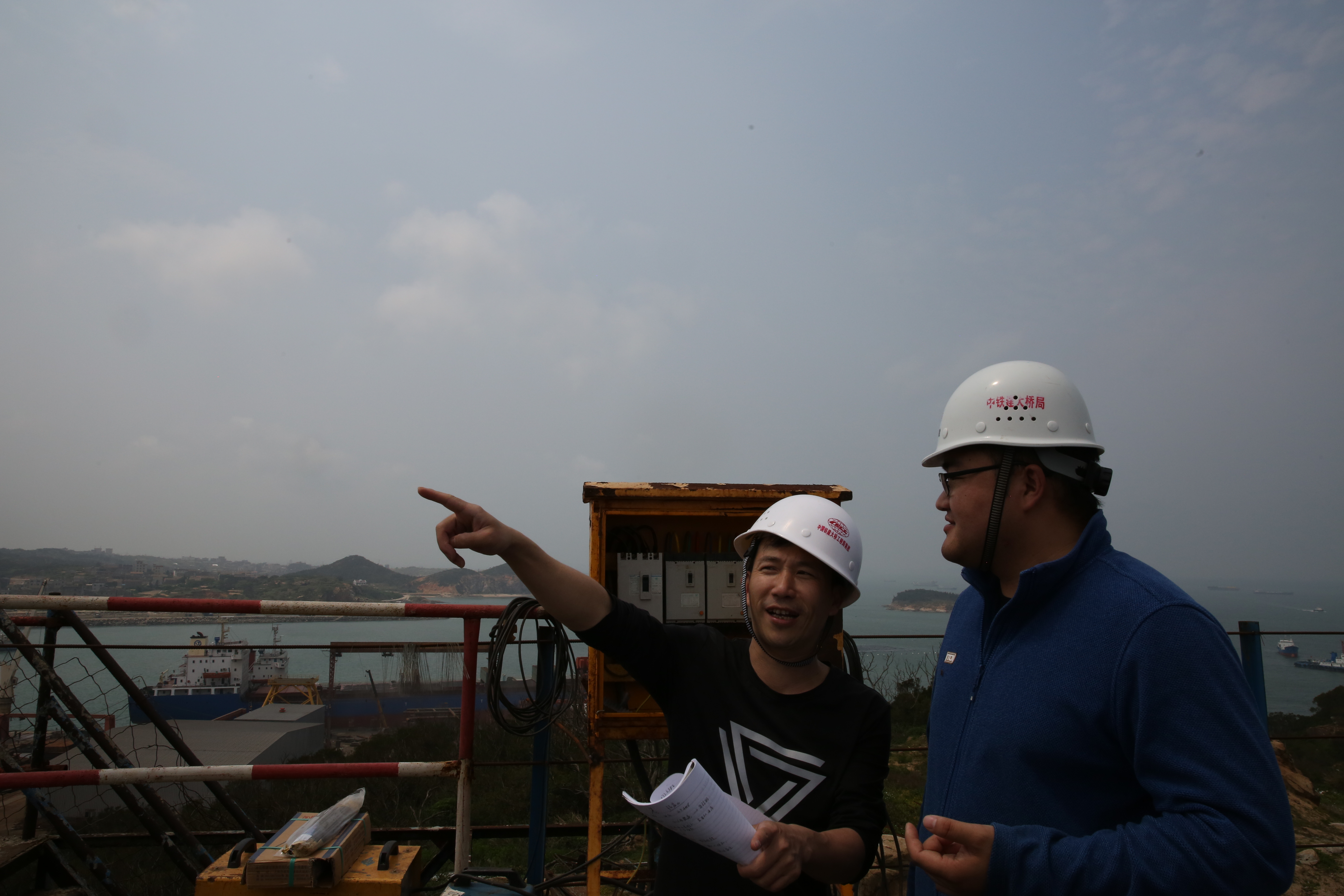 图为记者在平潭海峡公铁两用跨海大桥施工现场采访。