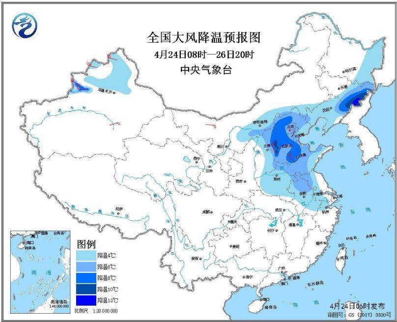预计,4月24日08时至26日20时,华北、东北地区东部和南部、黄淮、江淮、江南东北部、新疆伊犁河谷等地气温将下降4~8℃,局地10℃以上,西北地区东北部、华北大部、东北地区南部、黄淮、江淮、新疆西北部等地的部分地区有4~5级风,局地阵风可达6~7级,其中冷空气主要影响时段为24日至25日(见图3、图4)。中央气象台4月24日06时继续发布大风降温预报。