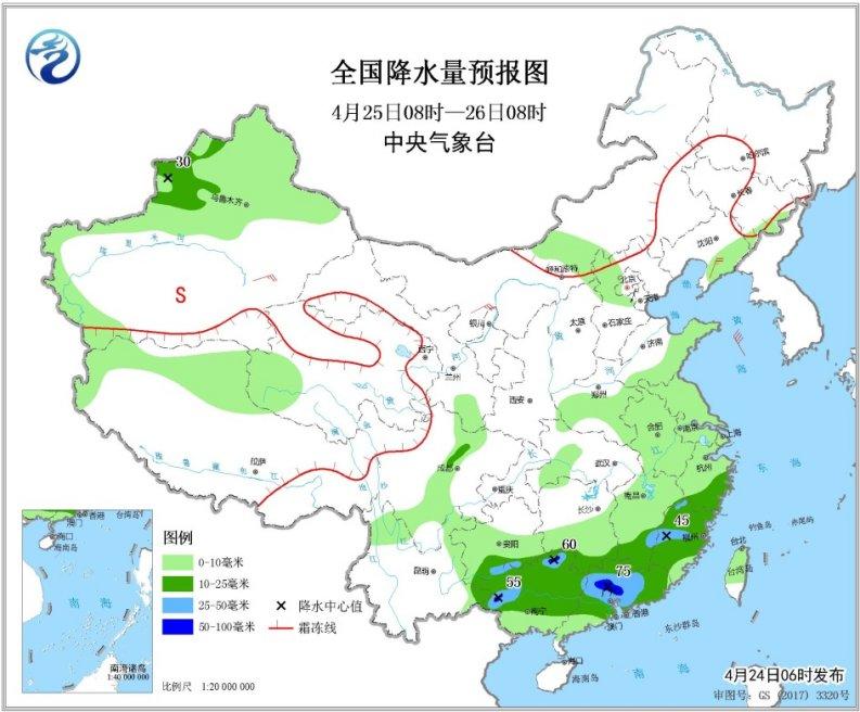 中新网4月24日电 据中央气象台消息,未来三天,江南、华南、贵州南部等地有分散性强降雨,以中到大雨量级为主,局地有暴雨;上述部分地区将伴有短时强降水、雷暴大风或冰雹等强对流天气。4月24日08时至26日20时,华北、东北地区东部和南部、黄淮、江淮、江南东北部、新疆伊犁河谷等地气温将下降4~8℃,局地10℃以上。
