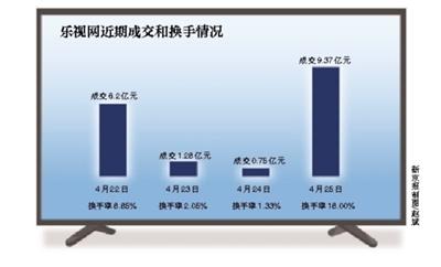 4月25日,乐视网成交额9.37亿元,换手率18.00%。此前三个交易日乐视网连续跌停,分别下跌9.96%、10.18%、9.85%。在这三个跌停中,仍有不少买单出现。4月22日乐视网成交6.2亿元,换手率达到8.85%;4月23日乐视网成交1.28亿元,换手率达到2.05%;4月24日乐视网成交0.75亿,换手率达到1.33%。