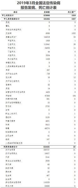附:2019年3月全国法定传染病报告发病、死亡统计表