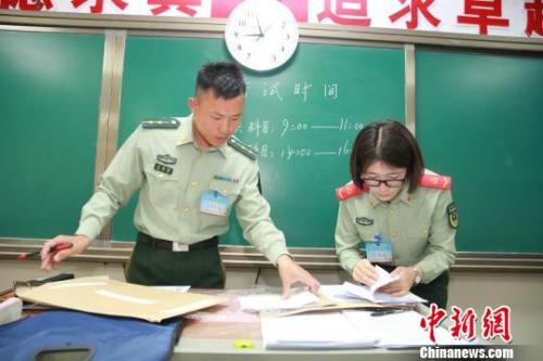 资料图:2018年全军面向社会公开招录文职人员考试。图为开考前监考人员检查试卷?!≈有?摄