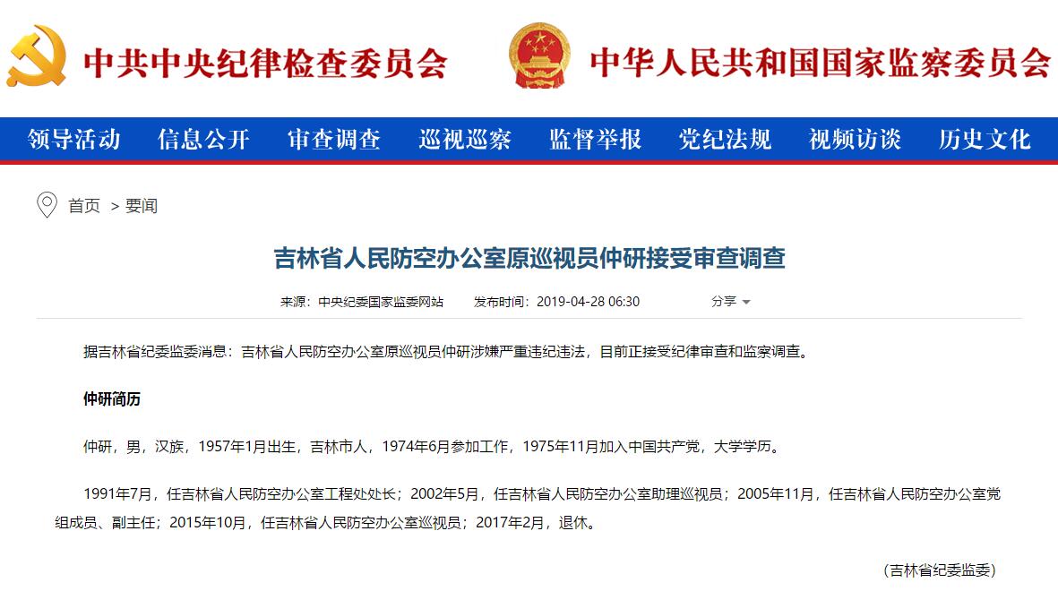 人民网北京4月28日电 据中央纪委国家监委网站消息,吉林省人民防空办公室原巡视员仲研涉嫌严重违纪违法,目前正接受纪律审查和监察调查。