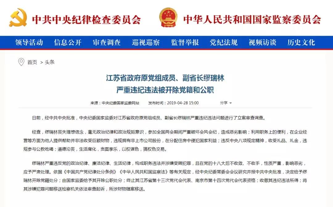 人民政协网北京4月28日电 记者4月28日从中央纪委国家监委官网获悉,经中共中央批准,中央纪委国家监委对江苏省政府原党组成员、副省长缪瑞林严重违纪违法问题进行了立案审查调查。