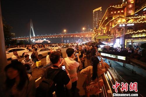 图为“五一”小长假期间,游客在重庆洪崖洞景区观光游玩。中新社发 苏自刚 摄