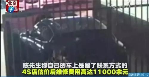 经4S店到场后检查后发现车头保险杠被刮了好几道,有凹陷痕迹,维修费预计高达1万1。陈先生随即报警。