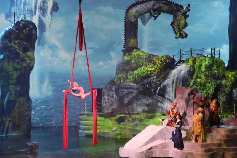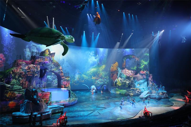 “八仙过海”神话故事源远流长,深受民众喜爱。2006年12月,八仙的故事被列入山东省第一批省级非物质文化遗产名录?!肚嘈恪芬园讼刹渭油跄秆缁岷?,驭水过海时与龙王发生争执,七仙为救被擒的蓝采和与四海龙王激斗的剧情徐徐展开。据了解,演绎现场是为《青秀》量身打造的国际型秀场,位于青岛西海岸新区星光岛,与东方影都大剧院相邻。