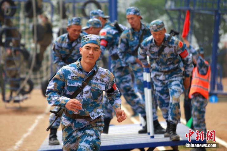 4月30日,中俄“海上联合—2019”军事演习陆战分队军事竞赛在中国海军陆战队某旅举行。图为中方参演陆战队员正在进行400米越障赛。中新社记者 李纯 摄
