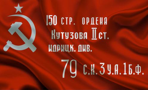 1945年5月1日在德国柏林帝国国会大厦升起的白俄罗斯第1方面军突击第3集团军第79步兵军伊德里茨第150步兵师突击旗。旗面文字为“白俄罗斯第1方面军突击第3集团军第79步兵军荣膺库图佐夫二级勋章的伊德里茨第150步兵师”。