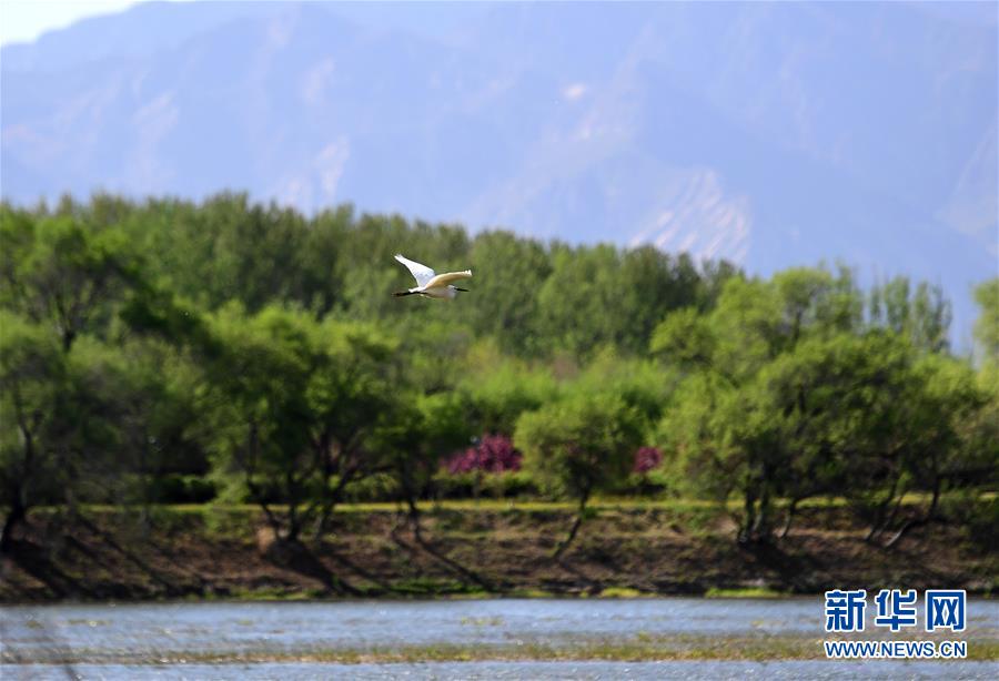 2019年4月30日,水鸟在妫水河畔的自然生态展示区飞翔。 新华社记者 张晨霖 摄