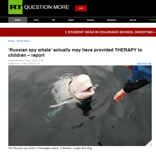 RT援引挪威Fiskeribladet新闻网的一篇新报道称,这个鲸鱼受过训练,可以为患有心理健康问题的儿童带来慰藉。