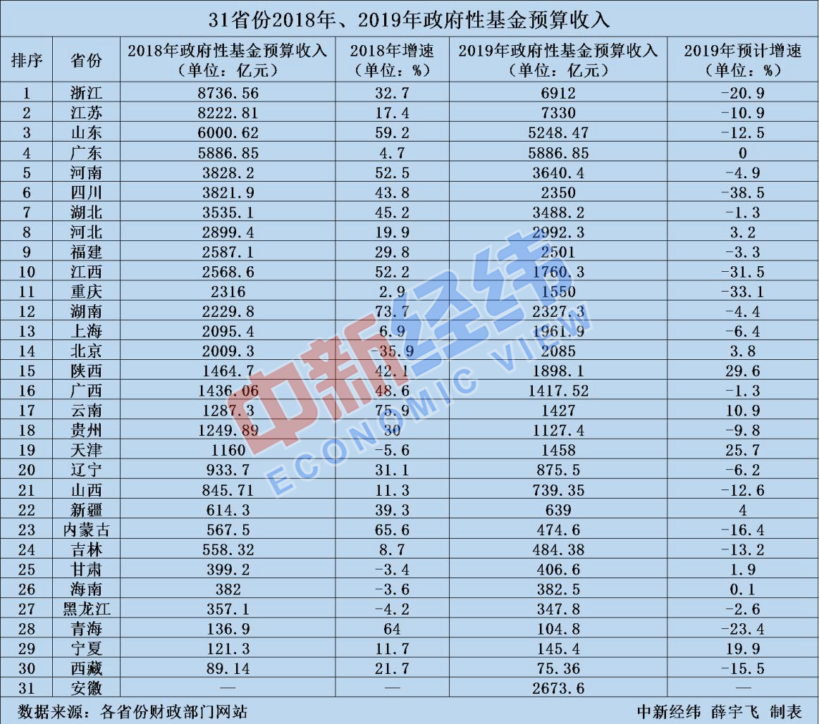 数据显示,各省份的政府性基金预算收入差别较大,在31个省、市、自治区中,浙江、江苏达到了8000亿级,广东为5000亿级,河南、四川、湖北超过3000亿元,河北、福建等7省份为2000亿级,陕西、广西等5地为1000亿级。西藏政府性基金预算收入最低,为89.14亿元。安徽省未公布2018年政府性基金预算收入。