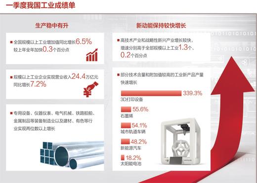 一季度规模以上工业增加值同比增长6.5% 工业经济稳中有进