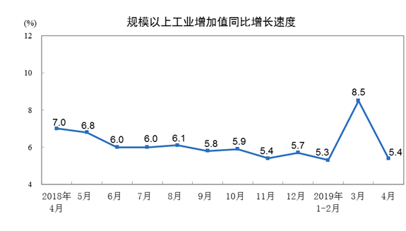 央视网消息:记者从国家统计局获悉,2019年4月份,规模以上工业增加值同比实际增长5.4 %(以下增加值增速均为扣除价格因素的实际增长率),比3月份回落3.1个百分点。从环比看,4月份,规模以上工业增加值比上月增长0.37%。1-4月份,规模以上工业增加值同比增长6.2%。