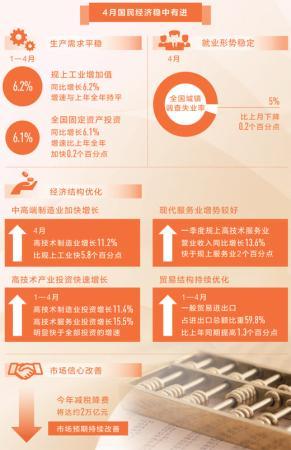 “判断经济形势还是要把这些短期因素过滤掉。从前4个月整体经济运行来看,总体平稳、稳中有进这个态势是没有改变的?!绷醢担诰迷诵衅轿鹊耐?,经济结构继续优化。