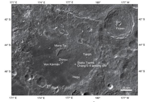 2019年1月3日,嫦娥四号在南极-艾特肯盆地着陆,成为人类历史上首个着陆于月球背面的无人探测器。论文中提到,着陆地选择最主要的考虑在于科学目标、着陆的安全性,为尽可能对月球地幔物质取样,着陆地点选择在相对平坦的南极-艾特肯盆地内的冯?卡门陨石坑(Von Kármán crater,直径约186公里),并部署了玉兔二号月球车对南极-艾特肯盆地进行探测。