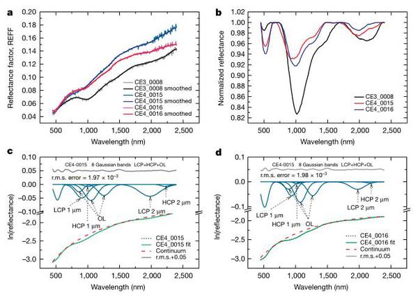 论文中介绍到,嫦娥四号着陆月球的第一天,可视-近红外成像光谱仪即成功获取了陆点附近两个两个探测点的高质量光谱数据。研究人员对数据分析后发现,他们所获的光谱数据和典型的月球表面物质的光谱数据存在差异。这也就意味着,着陆点附近检测到的这些物质与从月球表面采集到的大多数样品明显不同。特别地,这些材料含有镁铁质成分,主要是橄榄石(olivine)和低钙辉石(LCP)的混合物,高钙辉石(HCP)的含量则极低。