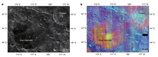 研究人员在论文中还提出,这些物质来源于探测点附近的芬森撞击坑(Finsen impact crater)撞击事件。芬森坑撞击事件进一步将南极-艾托肯盆地更深部物质挖掘出,产生的溅射物四处抛射,呈辐射线撒布在冯?卡门撞击坑“平原”上。